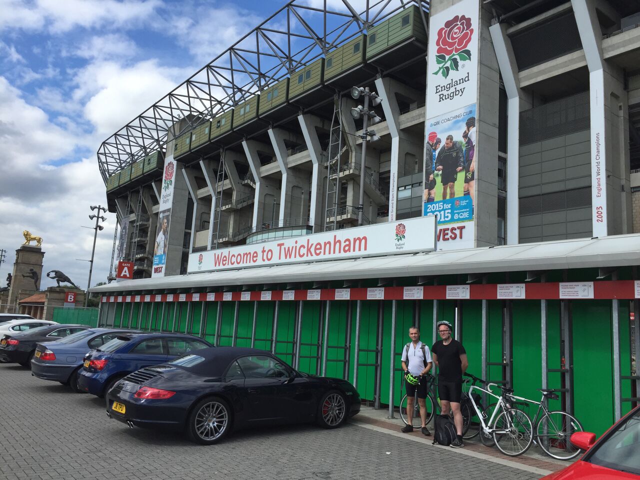 Our customarily haphazard navigation is even worse today due to mishaps with both GPS and smartphones, and our assumption that we’ll be fine with just an A-Z proves ill-founded as we leave the Home of Tennis behind. Our cross-country route over Putney Heath (which David notes has all the hallmarks of a dogging hotspot) and Wimbledon Common is complicated by a lack of cyclable roads, so we wheel our bikes disconsolately through dog turd strewn heathland before eventually reaching the far more pleasant and bike-friendly Richmond Park. Heading west on Sawyers Hill we’re overtaken by several proper cyclists, and get lost looking for Richmond Bridge before eventually reaching Twickenham. None of us is a Five Nations Aficionado, so the place doesn’t have the same appeal as Wimbledon, but we’re quite pleased with the shot we get from the car park.