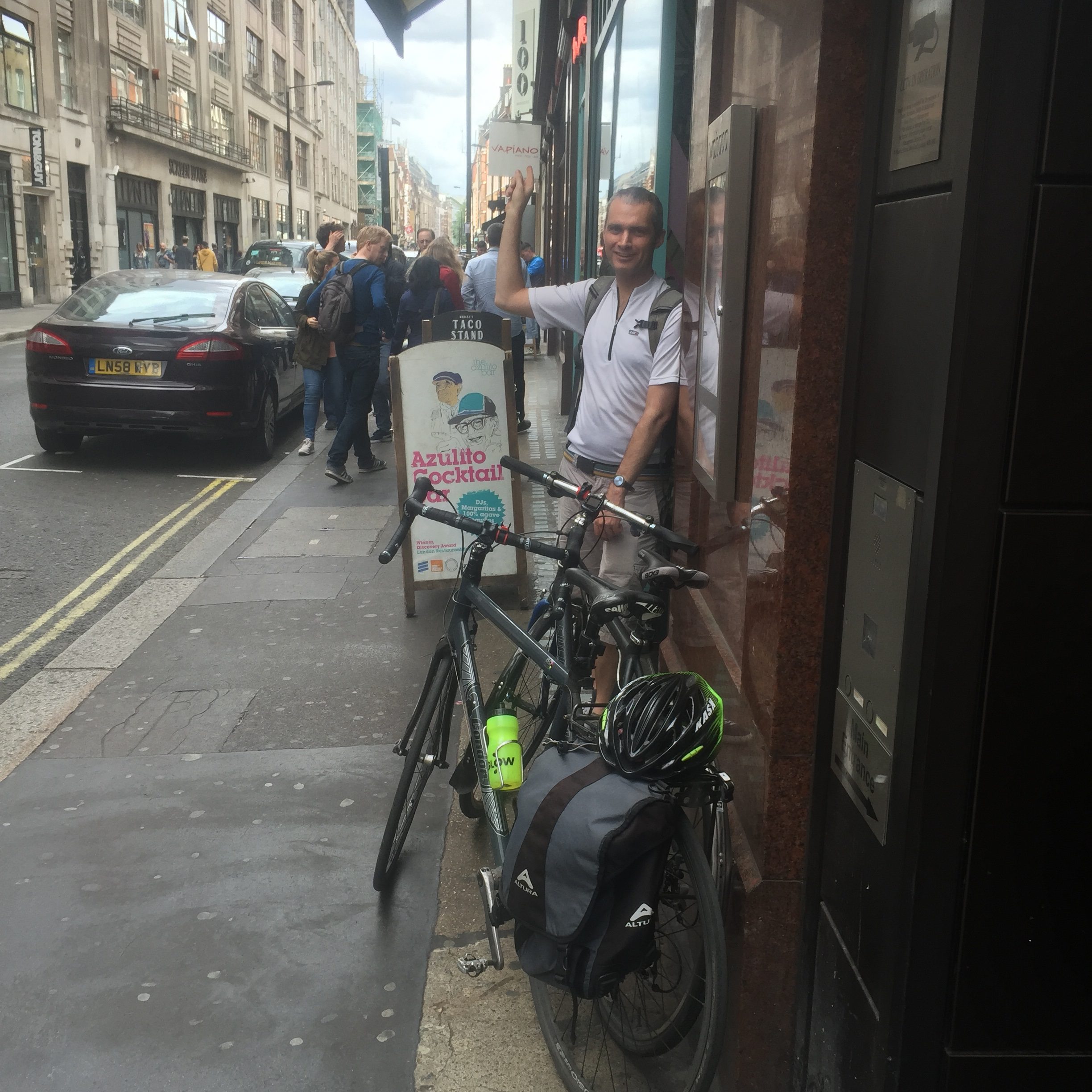 Ignorant of the fact that we’ve clocked up our century, we proceed down Gower Street and Shaftesbury Ave into Soho where we struggle with the one-way system, which is neither smooth nor commendable. As we stand on the pavement awkwardly consulting Google Maps on our phones, Dawes wryly remarks that this is the first time he’s sported lycra on Old Compton Street.