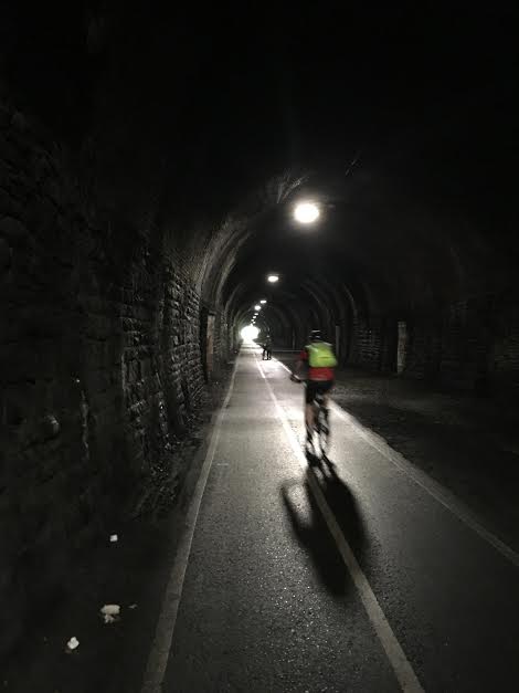 Steve then realises he’s left his Garmin charger at home (which we rely on for route navigation), but a quick stop at the extremely friendly and helpful Bristol Cycle Shack soon solves this, giving us a cable for free. Our faith in human nature restored, we begin our journey to Bath, along the pleasant Bristol and Bath Railway Path, a route we’d highly recommend, especially the dark tunnels, at the end of which there is light.